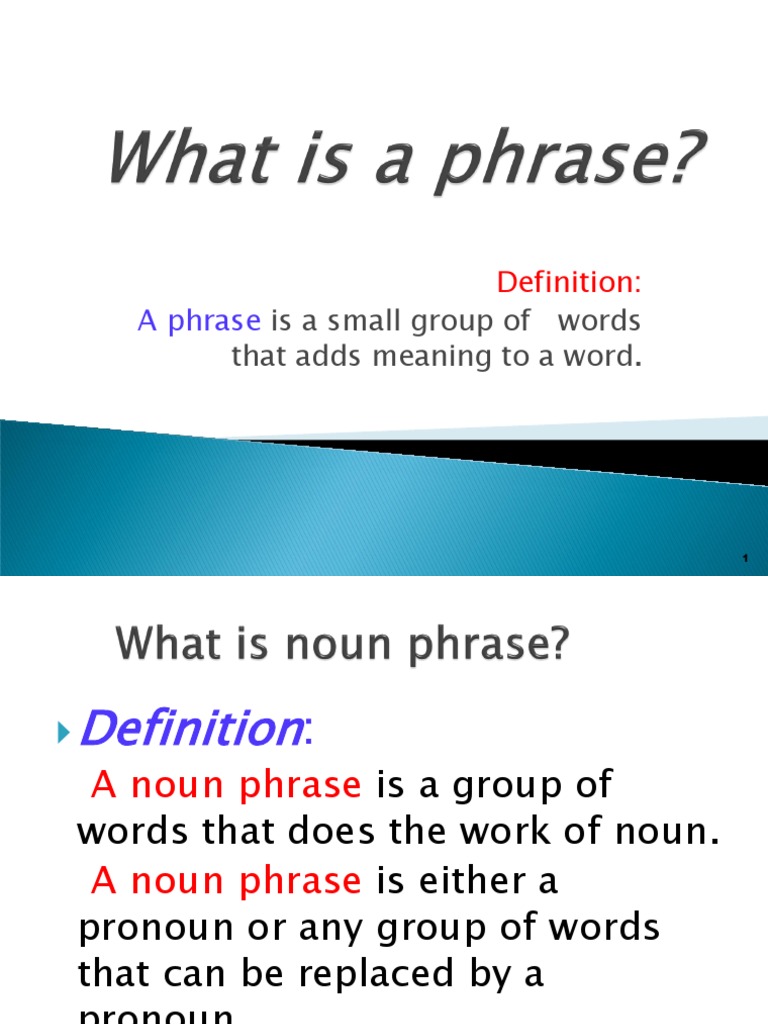 The head may be accompanied by dependent elements before or after it. A modifier is an adjective, an adjectival phrase, a secondary noun, a prepositional phrase or a relative clause. To guide students through a series of exercises which will help them to activity 1: Usually it is acted subject or object in a sentence position. (grammar) a phrase that has a noun (or indefinite pronoun) as its head or performs the same grammatical function as a noun.